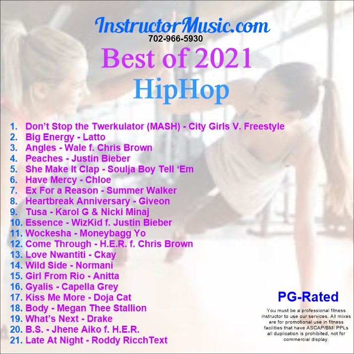 We continue to look back to ’21 and focus our spotlight on the Hip Hop and Rap jams that were at the top of the charts. The new workout mix has them all! From the City Girls to Chloe and from Drake to Doja Cat…they will heat your classes on chilly winter days! Highlights include “Big Energy”/Latto, “Have Mercy”/Chloe, “Wockesha”/Moneybagg Yo and “Love Nwantiti”/Ckay. This mix is PG-Rated.