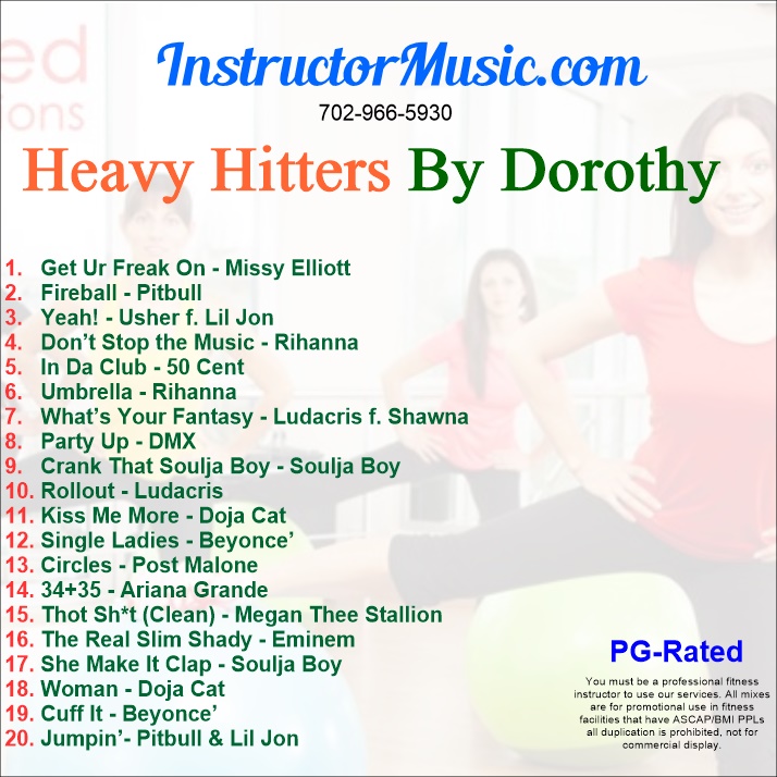 Dorothy came to us with a list of her best rhythmic crossover artists. We went back to the lab and funked up her “Heavy Hitters” custom workout mix! Nothing but hits from start to finish. Highlights feature “Get Ur Freak On”/Missy Elliott, “In Da Club”/50 Cent, “Party Up”/DMX and “Circles”/Post Malone.