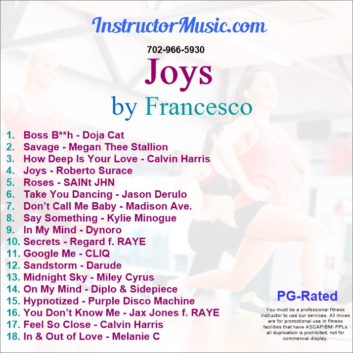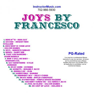 Francesco’s latest custom has disco and rap divas galore! Kylie to Doja Cat and Madison Ave. to Megan Thee Stallion…the new workout mix brings the dance heat! Highlights include “Savage”/Megan Thee Stallion, “Hypnotized”/Purple Disco Machine, “Sandstorm”/Darude, and “Roses”/SAINt JHN. There’s also a double shot of superstar DJ Calvin Harris! This mix is PG-Rated.